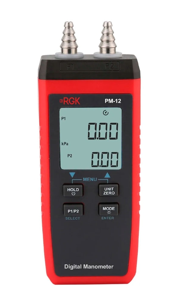Цифровой манометр RGK PM-12 - двухканальный прибор для измерения манометрического и дифференциального давления, который часто используется при настройке и пусконаладке систем вентиляции, отопления и любых других, где есть движение воздушных масс.